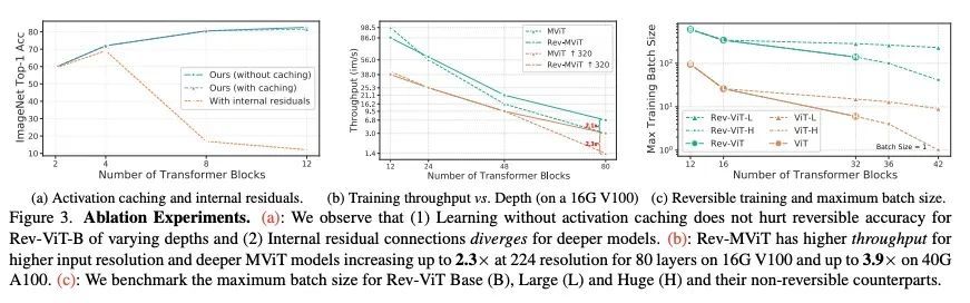 可逆视觉Transformer。本文提出可逆视觉Transformer,一种面向视觉识别的内存高效架构设计。通过将GPU内存足迹与模型的深度解耦,可逆视觉Transformer能实现Transformer架构的内存高效扩展。将两种流行的模型,即视觉Transformer和多尺度视觉变Transformer,改为可逆变体,在各模型规模,对图像分类、目标检测和视频分类的任务进行了广泛的基准测试。在模型复杂度、参数和准确度相同的情况下,可逆视觉Transformer减少了高达15.5倍的内存占用,证明了可逆视觉Transformer作为资源有限的训练机制的有效骨干的前景。重新计算激活的额外计算负担对于更深层的模型来说是可以克服的,其吞吐量可以比非可逆的对应模型增加3.9倍。
