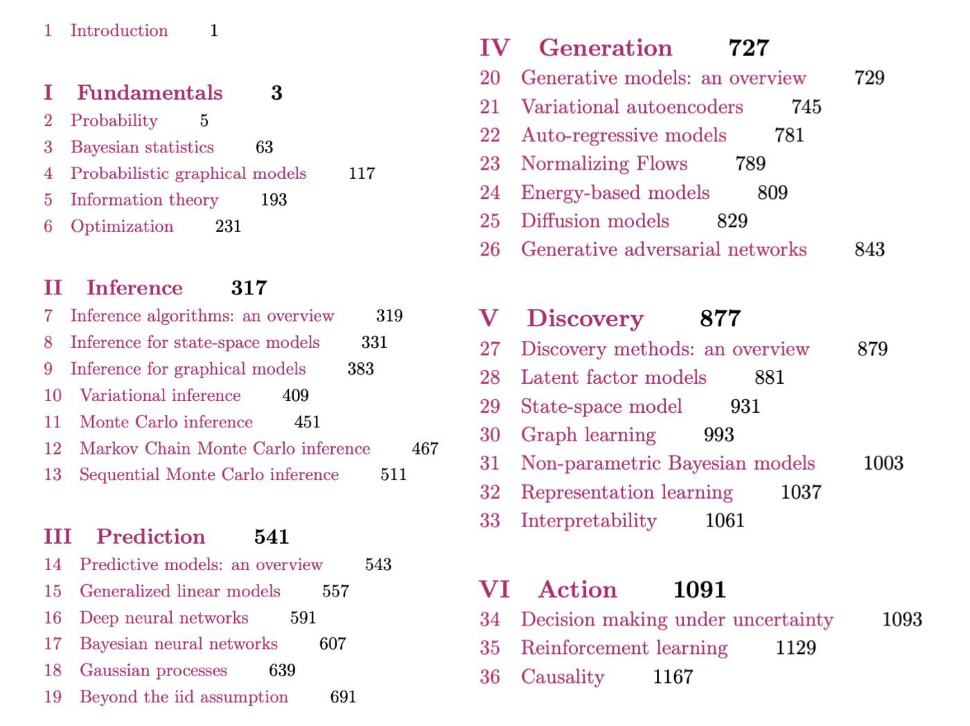 这是图书目录,涵盖了生成模型、贝叶斯推理、强化学习、因果关系、分布偏移等前沿主题。