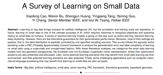 对大数据的学习为人工智能(AI)带来了成功,但注释和训练成本昂贵。未来,在小数据上学习是AI的最终目的之一,这需要机器像人类一样识别依赖小数据的目标和场景。一系列的机器学习模型正在以这种方式进行,如主动学习、少样本学习、深度聚类。然而,几乎没有理论保证它们的泛化性能。而且,它们的大多数设置都是被动的,即标签分布是由一个指定的采样场景显式控制的。该调查遵循PAC (Probably Approximately Correct)框架下的不可知论主动抽样,使用监督和非监督方式分析小数据学习的泛化误差和标签复杂性。通过这些理论分析,我们从两个几何角度对小数据学习模型进行了分类: 欧几里得和非欧几里得(双曲)均值表示,并给出了它们的优化解。随后总结了一些可能受益于小数据学习的潜在学习场景,并对其潜在的学习场景进行了分析。最后,一些具有挑战性的应用,如计算机视觉,自然语言处理,可能受益于学习小数据也被综述。