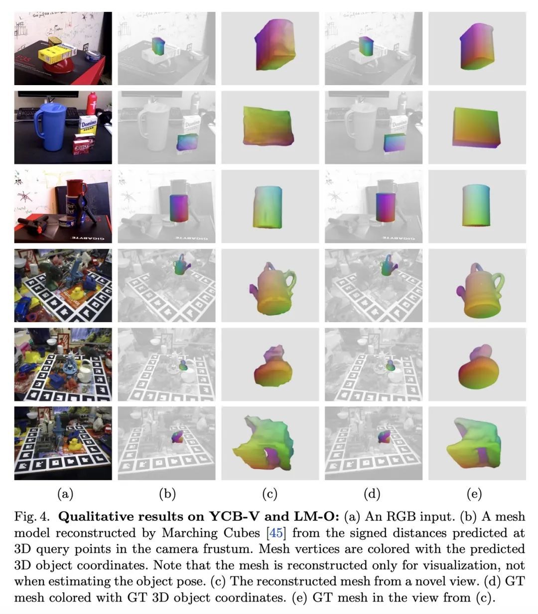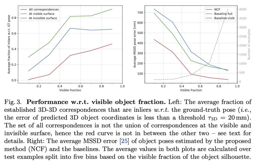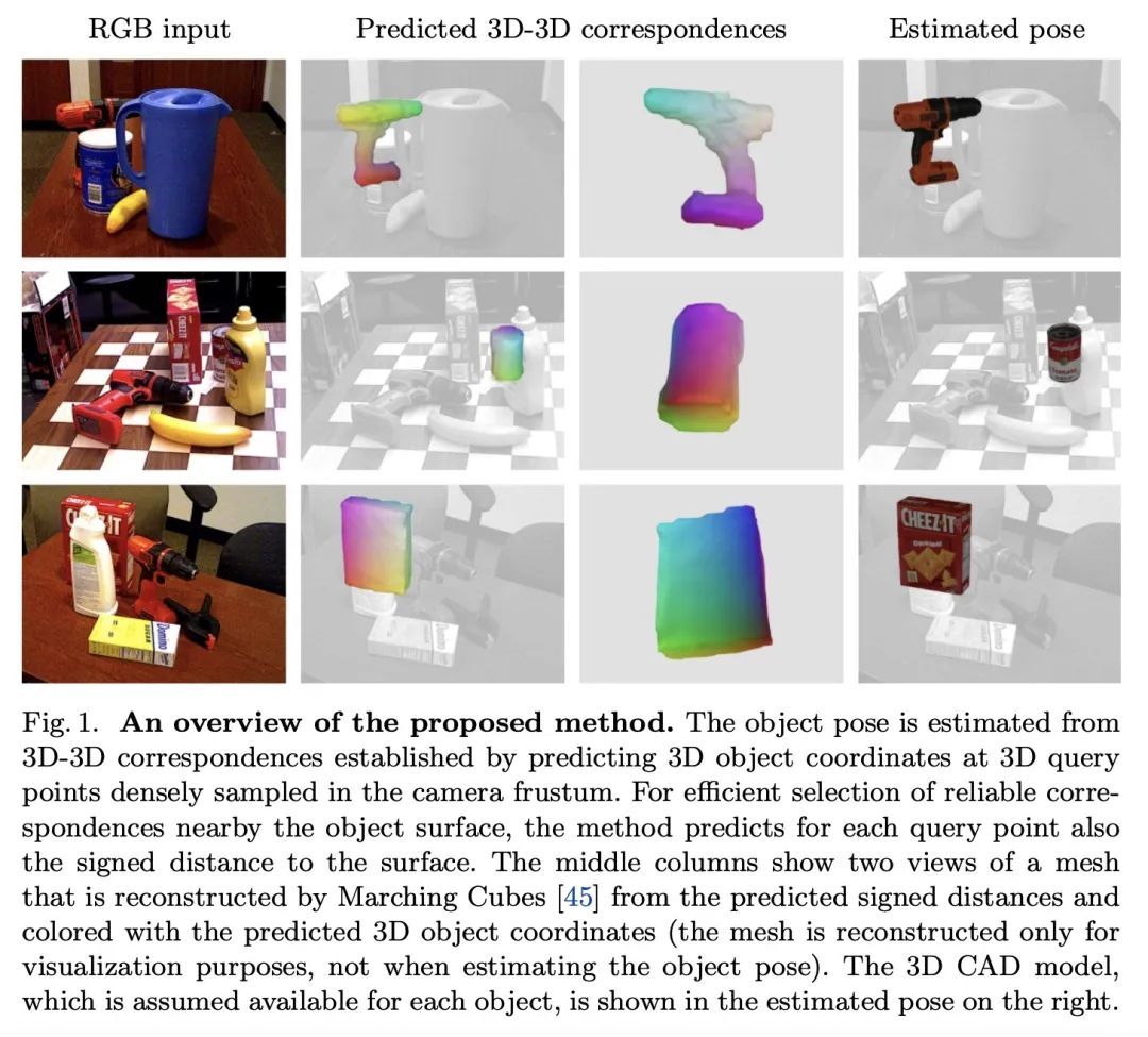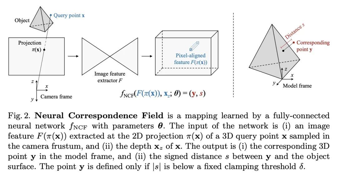 面向物体姿态估计的神经对应场。本文提出一种从单幅RGB图像中估计具有可用3D模型的刚性物体的6DoF姿态的方法。与经典的基于对应关系的方法不同,该方法是在输入图像的像素上预测3D物体坐标,而所提出方法是在相机截锥采样的3D查询点上预测3D物体坐标。从像素到3D点的转变,受到最近的PIFu式3D重建方法的启发,可对整个物体进行推理,包括其(自)遮挡部分。对于与像素对齐的图像特征相关的3D查询点,训练一个全连接神经网络来预测:(i) 相应的3D物体坐标,以及 (ii) 与物体表面的有符号距离,第一项只针对表面附近的查询点定义。把这个网络实现的映射称为神经对应场。通过Kabsch-RANSAC算法从预测的3D-3D对应关系中鲁棒地估计物体的姿态。所提出方法在三个BOP数据集上取得了最先进的结果,特别是在具有挑战性的遮挡情况下显示出优越性。