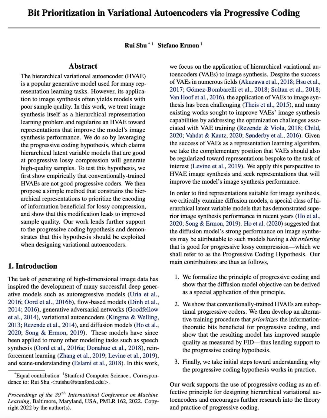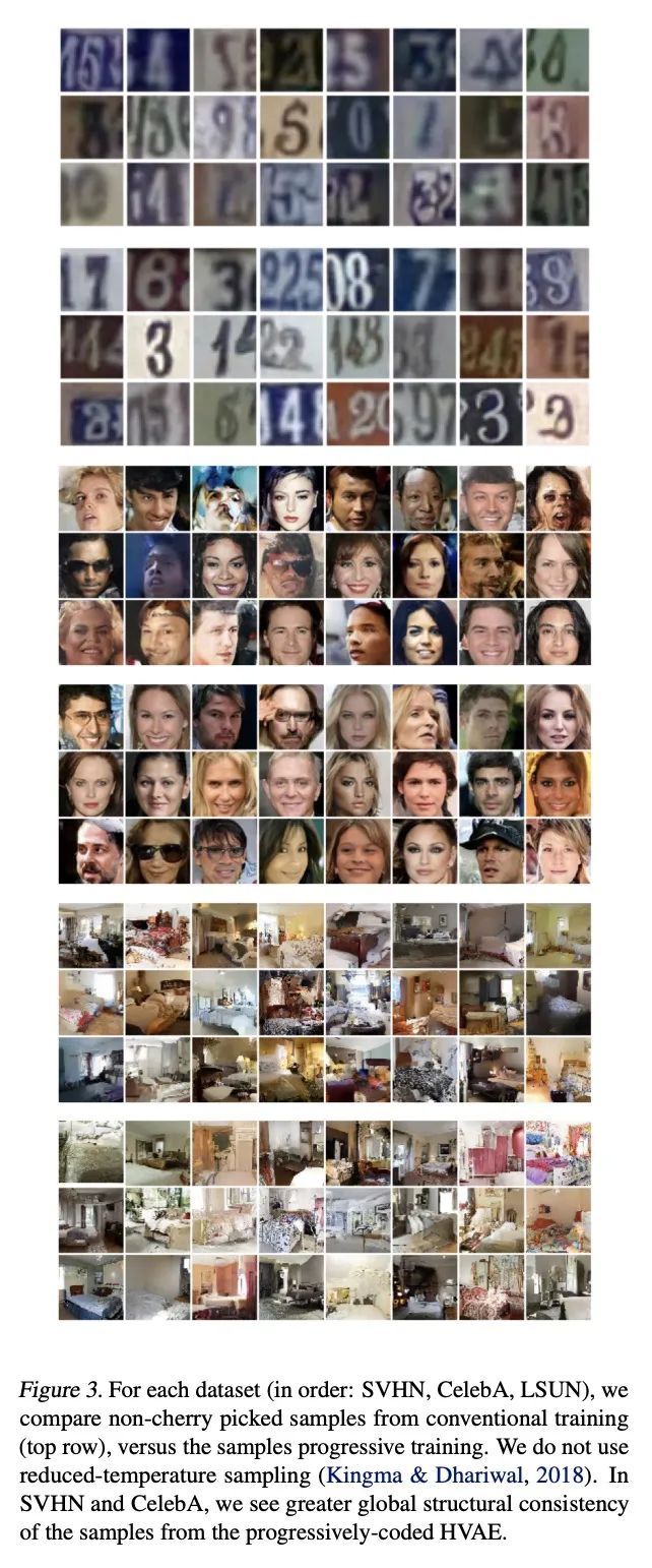 基于渐进式编码的变分自编码器位优先确定。分层变分自编码器(HVAE)是一种流行的生成模型,用于许多表示学习任务。然而,它在图像合成中的应用常常产生样本质量差的模型。本文将图像合成本身视为一个层次化表示学习问题,并对HVAE进行正则化,以提高模型的图像合成性能。通过利用渐进式编码假说来做到这一点,该假说声称擅长渐进式有损压缩的层次潜变量模型将产生高质量样本。为测试这一假设,首先根据经验表明,传统训练的HVAE不是好的渐进式编码器。然后,提出了一个简单方法,约束分层表示以优先编码有利于有损压缩的信息,并表明这种修改导致了样本质量的提高。本文工作为渐进式编码假说提供了进一步的支持,并表明在设计变分自编码器时应利用这一假说。