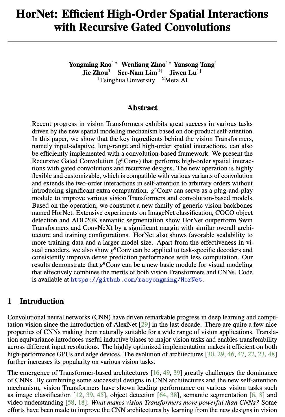 [CV] HorNet: Efficient High-Order Spatial Interactions with Recursive Gated Convolutions