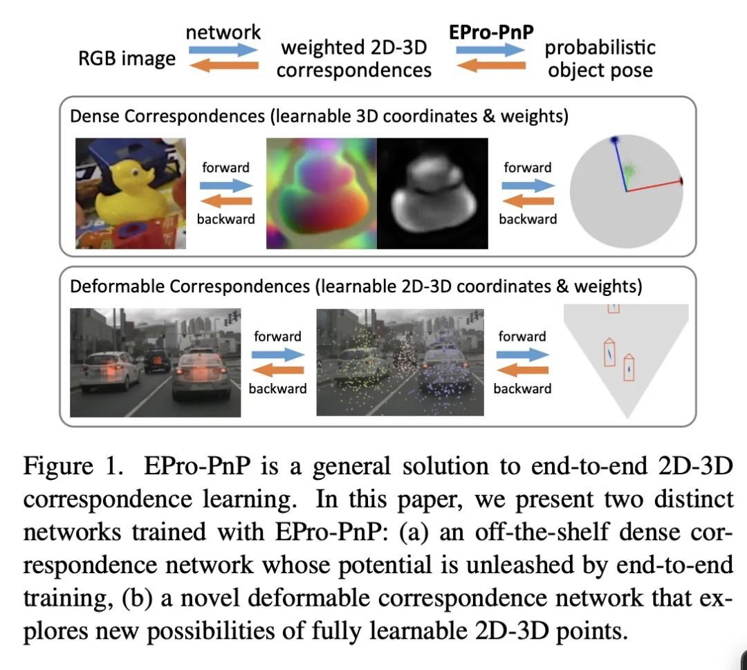 EPro-PnP:面向单目物体姿态估计的通用端到端概率透视n点。通过透视n点Perspective-n-Points(PnP)从单幅RGB图像中定位3D物体,是计算机视觉中一个长期存在的问题。在端到端深度学习的驱动下,最近的研究建议将PnP解释为一个可微层,这样就可以通过反向传播物体姿态梯度部分学习2D-3D点对应关系。然而,从头开始学习整个无限制的2D-3D点集在现有的方法中无法收敛,因为确定姿态本身就是不可微的。本文提出Pro-PnP,一种用于通用端到端姿态估计的概率PnP层,输出SE(3)流形上的姿态分布,本质上是将分类Softmax带到连续域。2D-3D坐标和相应权重被视为中间变量,通过最小化预测和目标姿态分布之间的KL散度来学习。其基本原理统一了现有的方法,类似于注意力机制。EPro-PnP明显优于竞争基准,在LineMOD 6DoF姿态估计和nuScenes 3D目标检测基准上缩小了基于PnP的方法与特定任务领先模型之间的差距。
