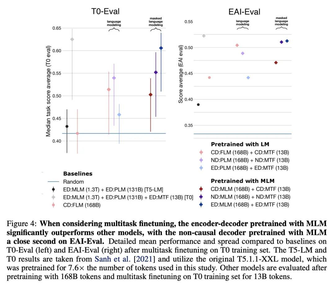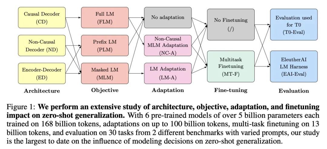 什么样的语言模型架构和预训练目标零样本泛化效果最好?大型预训练Transformer语言模型已被证明具有零样本泛化能力,可以执行各种没有明确训练过的任务。然而,最先进的模型所使用的架构和预训练目标差异很大,而且对这些因素的系统比较也很有限。本文对建模选择及其对领样本泛化的影响进行了大规模评估。专注于文本到文本模型,实验了三种模型架构(仅因果/非因果解码器和编-解码器),用两种不同的预训练目标(自回归和掩码语言建模)进行训练,并在有和没有多任务提示微调的情况下进行评估。用超过50亿参数训练超过1700亿Token的模型,增加了所的出结论迁移到更大尺度的可能性。实验表明,在纯无监督预训练后,在自回归语言建模目标上训练的纯因果解码器模型表现出最强的零样本泛化。然而,在实验中,输入上具有非因果可见性的模型在经过掩码语言建模目标训练后,再经过多任务微调,表现最好。因此,本文考虑了跨架构和目标的预训练模型的自适应问题。结果发现,预训练非因果解码器模型可以被改编成高性能的生成性因果解码器模型,用自回归语言建模作为下游任务。此外,预训练的因果解码器模型可以有效地自适应非因果解码器模型,最终在多任务微调后达到有竞争力的性能。