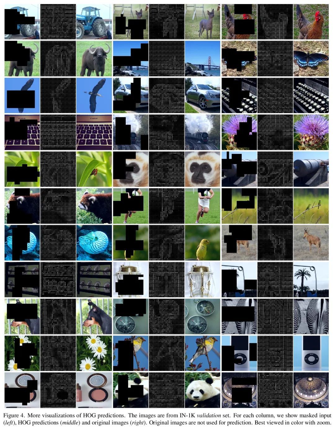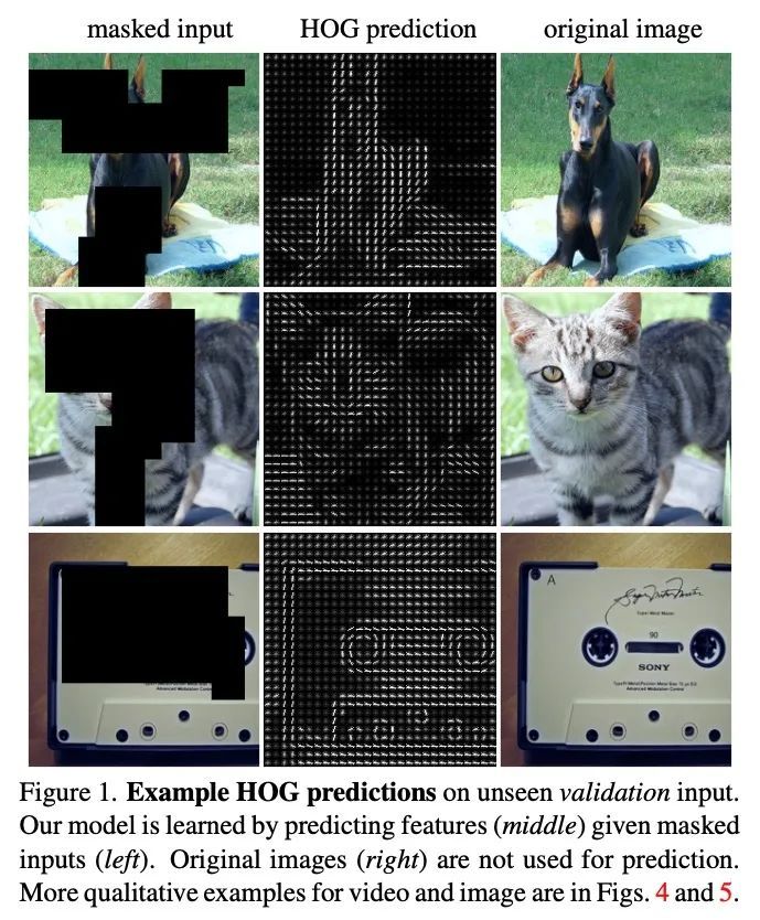 面向自监督视觉预训练的掩码特征预测。本文提出掩码特征预测(MaskFeat),用于视频模型的自监督预训练。首先随机掩码输入序列的一部分,然后预测被掩码区域的特征。研究了五种不同类型的特征,发现定向梯度直方图(HOG),一种手工设计的特征算子,在性能和效率方面都很好。HOG中局部对比度归一化是取得良好效果的关键,与早期使用HOG进行视觉识别的工作相一致。所提出方法可以学习丰富的视觉知识,并驱动基于Transformer的大规模模型。在不用额外的模型权重或监督的情况下,MaskFeat在未标记视频上进行预训练,在Kinetics-400上与MViT-L一起取得了前所未有的结果,在Kinetics-600上为88.3%,在Kinetics-700上为80.4%,在AVA上为38.8mAP,而在SSv2上为75.0%。进一步将MaskFeat推广到图像输入,解释为单帧视频,并在ImageNet上获得了有竞争力的结果。