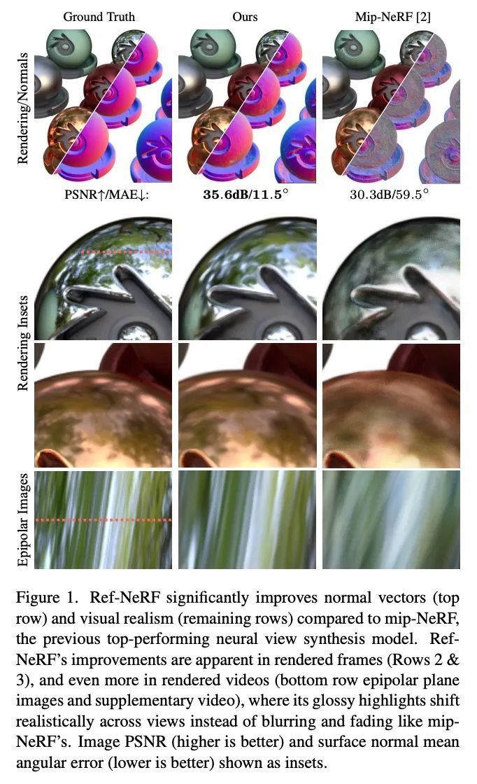 Ref-NeRF:神经辐射场结构化视图依赖性外观。神经辐射场(NeRF)是一种流行的视图合成技术,将场景表示为一个连续的体函数,由多层感知器设置参数,提供每个位置的体密度和与视图相关的发射辐射。虽然基于NeRF的技术擅长表现具有平滑变化的视图依赖性外观的精细几何结构,但往往不能准确地捕捉和再现有光泽表面的外观。本文通过引入Ref-NeRF来解决这一局限性,用反射辐射表示方法取代了NeRF的视图依赖性出射辐射的参数化,用一系列空间变化的场景属性来构造这一函数。与法线向量的正则器一起,所提出模型大大改善了镜面反射的真实性和准确性,同时对出射光度的内部表示是可解释的,对场景编辑很有用。