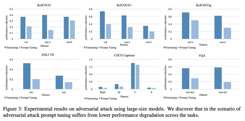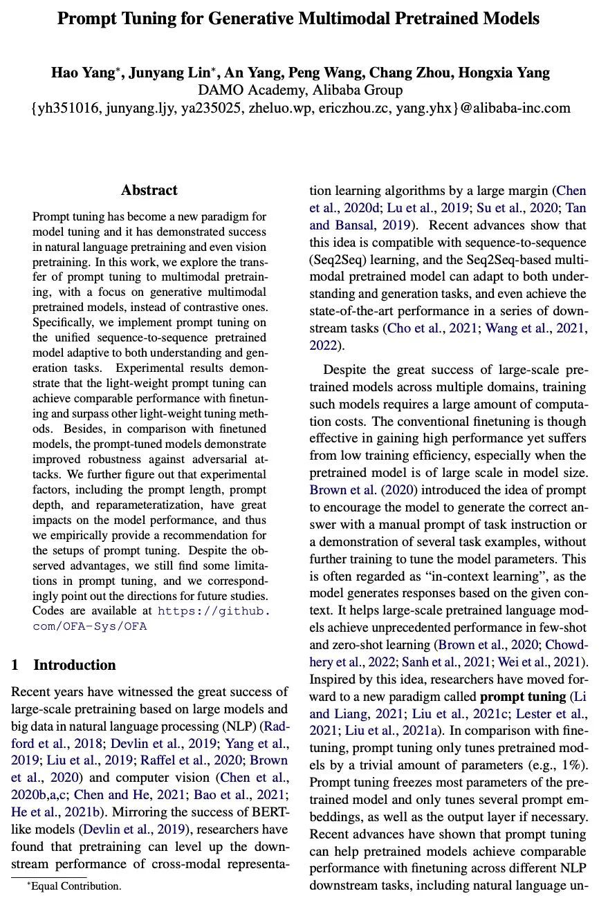 生成式多模态预训练模型的提示微调。提示微调已经成为模型微调的新范式,在自然语言预训练甚至视觉预训练中显示出成功。本文探索将提示微调迁移到多模态预训练中,重点是生成式多模态预训练模型,而不是对比式模型。在统一的序列到序列预训练模型上实施提示微调,以自适应理解和生成任务。实验结果表明,轻量的提示微调可以达到与微调相当的性能,并超过其他轻量微调方法。此外,与微调模型相比,提示微调模型对对抗性攻击表现出更好的鲁棒性。包括提示长度、提示深度和重参数化在内的实验因素对模型性能有很大的影响,本文从经验上对提示微调的设置提出了建议。