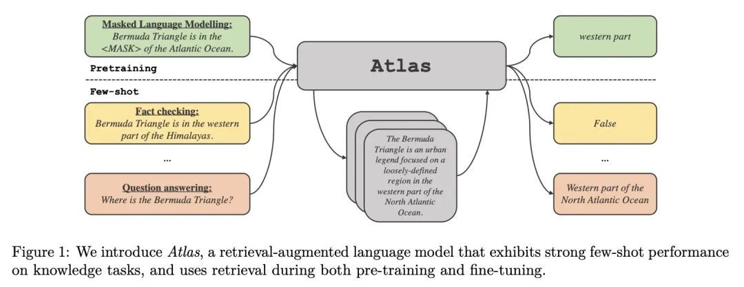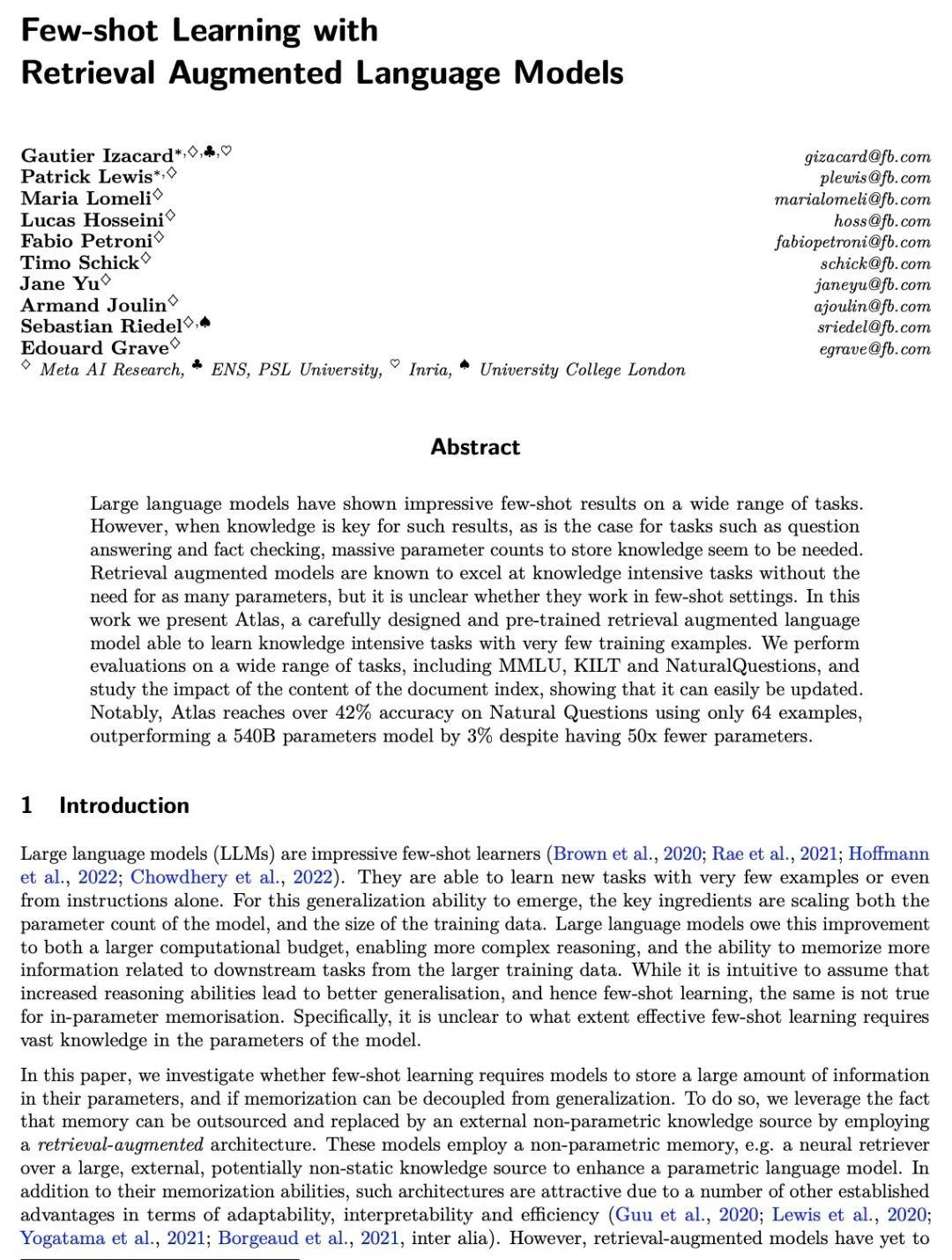 基于检索增强语言模型的少样本学习。大型语言模型在广泛的任务中显示出令人印象深刻的少样本结果。然而,当知识是这种结果的关键时,如问答和事实核查等任务,似乎需要大量参数来存储知识。众所周知,检索增强模型在知识密集型任务中表现出色,不需要那么多参数,但目前还不清楚它们在少样本情况下是否有效。本文提出Atlas,一种精心设计和预训练的检索增强语言模型,能用很少的训练样本学习知识密集型任务。本文对广泛的任务进行了评估,包括MMLU、KILT和NaturalQuestions,并研究了文档索引内容的影响,表明它可以很容易地更新。值得注意的是,Atlas只用了64个样本就达到了42%以上的精度,尽管参数少了50倍,却比540B参数模型的精度高出了3%。