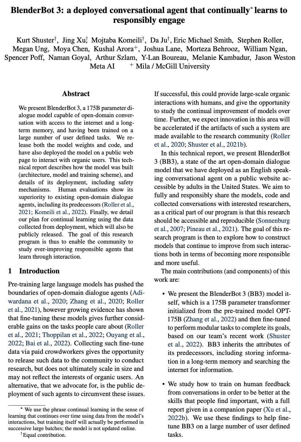 [CL] BlenderBot 3: a deployed conversational agent that continually learns to responsibly engage
