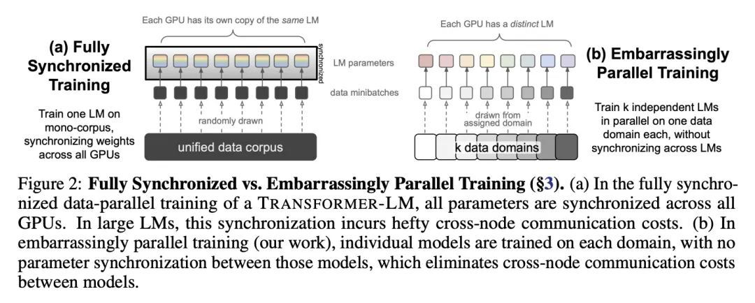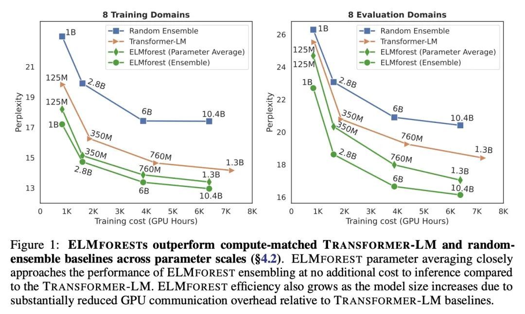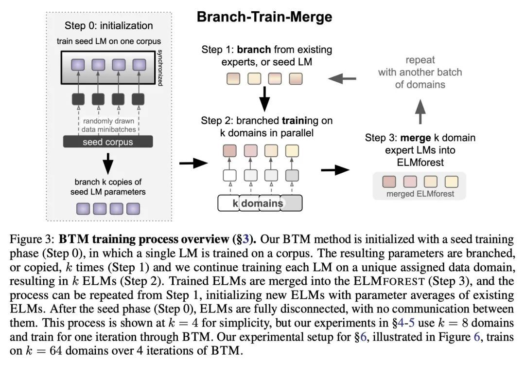 分支-训练-合并:专家语言模型的异步并行训练。本文提出Branch-Train-Merge(BTM),一种高通信效率的算法,用于对大型语言模型(LLM)进行异步并行训练,有可能在不同数据子集上独立训练一类新的语言模型的子部分,从而消除目前训练语言模型所需的大规模多节点同步。BTM学习一组独立的EXPERT LM(ELM),每个都专门用于不同的文本域,如科学或法律文本。这些ELM可以被添加和删除以更新数据覆盖率,可以组合以推广到新的域,也可以被平均化以缩减到一个单一LM以实现高效推理。新的ELM是通过从当前集合中的ELM(混合)分支学习的,在新域数据上进一步训练参数,然后将得到的模型合并到集合中供将来使用。实验表明,在控制训练成本的情况下,BTM与GPT式Transformer的LM相比,提高了域内和域外的困惑度。广泛的分析表明,这些结果对不同的ELM初始化方案是鲁棒的,但需要专家领域的特定化;具有随机数据分割的LM集合表现不佳。本文还提出一项关于将BTM扩展到64个域的新语料库中的研究(总共192B个空格分隔Token);由此产生的LM(总参数22.4B)的表现与用2.5倍的计算量训练的Transformer LM一样好。这些收益随着域数量的增加而增加,这表明在未来的工作中可以用更积极的并行性来有效地训练更大的模型。