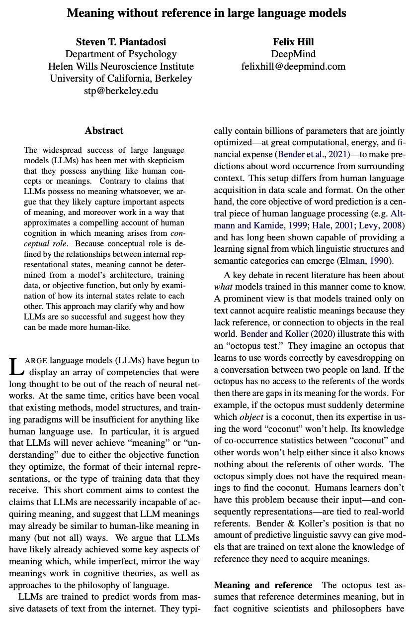 大型语言模型中的概念与意义。大型语言模型(LLM)的广泛成功遭到了质疑,认为它们没有类似人类的概念或意义。与认为LLM不具备任何意义的说法相反,本文认为它们很可能捕捉到了意义的重要方面,其工作方式接近于人类认知的一种令人信服的说法,即意义产生于概念模型。因为概念模型是由内部表示状态间的关系定义的,所以意义不能从模型的结构、训练数据或目标函数中确定,而只能通过检查其内部状态如何相互关联来确定。这种方法可能会澄清LLM为什么和如何如此成功,并建议如何使它们更像人类。