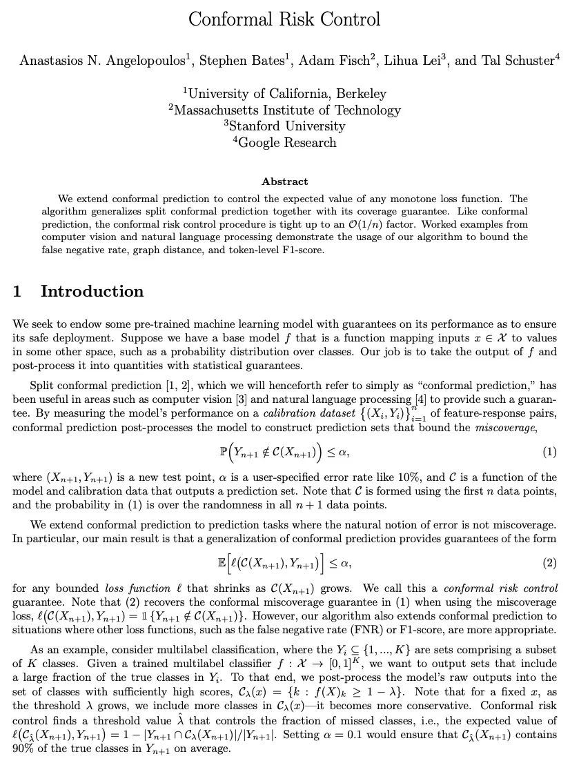 保形风险控制。本文将保形预测扩展到任意单调损失函数预期值的控制。该算法推广了分裂保形预测及其覆盖保证。与保形预测一样,保形风险控制程序的严密性达到了O(1/n)级。来自计算机视觉和自然语言处理的工作实例证明了所提出算法可广泛用于约束假阴性率、图距离和token级F1分数。