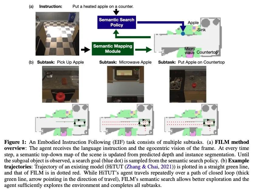 FILM:基于模块化方法的语言指令遵循。最近用于具身指令遵循的方法通常是用模仿学习进行端到端训练。这往往需要使用专家轨迹和低级语言指令,这些方法假设神经状态将整合多模态语义来进行状态跟踪,建立空间记忆,探索和长程规划。相比之下,本文提出一种具有结构化表示的模块化方法,(1) 建立场景语义图,(2) 用语义搜索策略进行探索,以实现自然语言目标。所提出的模块化方法实现了SOTA性能(24.46%),与之前工作相比有很大差距(绝对值提升8.17%),同时通过放弃专家轨迹和低级指令,使用更少的数据。然而,利用低级语言可以进一步提高所提出方法的性能(26.49%)。研究结果表明,即使在没有专家轨迹或低级指令的情况下,明确的空间记忆和语义搜索策略可以为状态跟踪与指导提供更强大和更通用的表示。