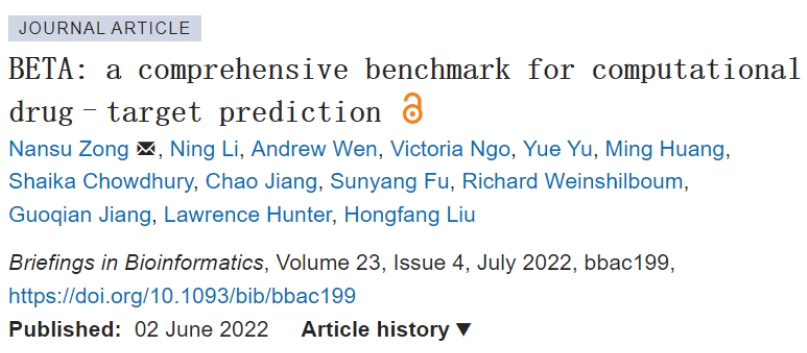 该研究以「BETA: a comprehensive benchmark for computational drug–target prediction」为题,于 2022 年 6 月 2 日发布在《Briefings in Bioinformatics》。