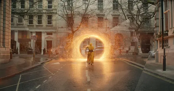 传送门可以说是人类最想拥有的超能力之一了,要想在现实中体验,那确实只能想一想了。不过,利用虚拟现实、增强现实等技术,可以从视觉上实现传送门,这在游戏和电影中都经常能见到,比如电影《奇异博士》中的传送门特效: