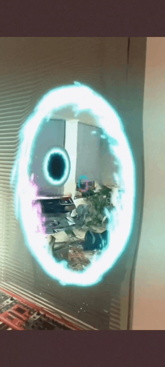 大神将虚拟信息与真实世界巧妙融合,用一把与游戏中类似的虚拟传送枪,在墙壁、天花板以及各种物体上都可以召唤出一个带红色或蓝色光圈的传送门,传送门的另一头是房间的别处或者其他房间,还可以从室外传送到室内。