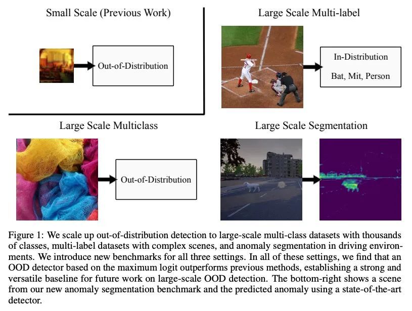 大规模场景下异常检测器的改进和评估。检测分布外样本对于安全关键的机器学习应用非常重要,如检测新的生物现象和自动驾驶汽车。然而,现有的研究主要集中在简单的小规模场景。为了给更现实的分布外检测创造条件,本文从小规模场景出发,探索具有高分辨率图像和数千个类的大规模多类和多标签场景。为了使未来在真实世界环境中的工作成为可能,本文为三种大规模环境创建了新的基准。为了测试ImageNet多类异常检测器,本文引入一种新的异常物种数据集。利用ImageNet-21K来评估PASCAL VOC和COCO多标签异常检测器。第三,通过引入一个带有道路异常的分割基准,为异常分割引入了一个新基准。在这些更现实的环境中对分布外检测进行了广泛的实验,发现一个基于最大对数的简单检测器在所有大规模的多类、多标签和分割任务中都优于之前的方法,为未来的工作建立了一个简单的新基线。