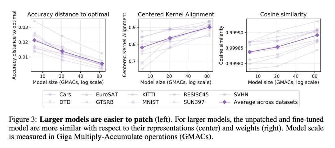 通过权重插值修补开放词表模型。像CLIP这样的开放词表模型在许多图像分类任务中取得了高精度。然而,有一些情况下,其零样本性能远非最佳。本文研究了模型的修补,目标是提高特定任务的精度,而不降低性能已经足够的任务的精度。为实现这一目标,本文引入PAINT,一种修补方法,用微调前的模型权重和在任务上微调后的权重之间的插值来进行修补。在zeroshot CLIP表现不佳的九个任务上,PAINT将精度提高了15到60个百分点,同时将ImageNet的精度保持在零样本模型的一个百分点之内。PAINT还允许一个单一模型在多个任务上进行修补,并随着模型规模的扩大而改善。此外,本文还发现了一些广泛的迁移案例,在一个任务上打补丁可以提高其他任务的精度,即使这些任务的类别不相干。最后,调查了普通基准以外的应用,如计算或减少对CLIP的字体攻击的影响。结果表明,有可能扩大开放词表模型达到高准确性的任务集,而不需要从头开始重新进行训练。