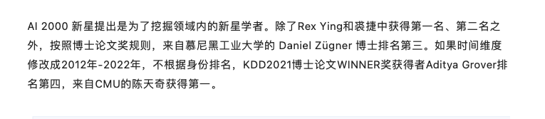 博士论文奖Winner是来自耶鲁大学的 Rex Ying,Runner Up是清华大学的Jiezhong Qiu(裘捷中)和慕尼黑理工的Daniel Zügner。此前,AMiner AI 2000对博士论文奖进行过预测,根据2018-2022年间AI2000数据挖掘领域新星和贡献值,排名前三的分别是Rex Ying,裘捷中和Daniel Zügner,这一结果与获奖情况完全一致。