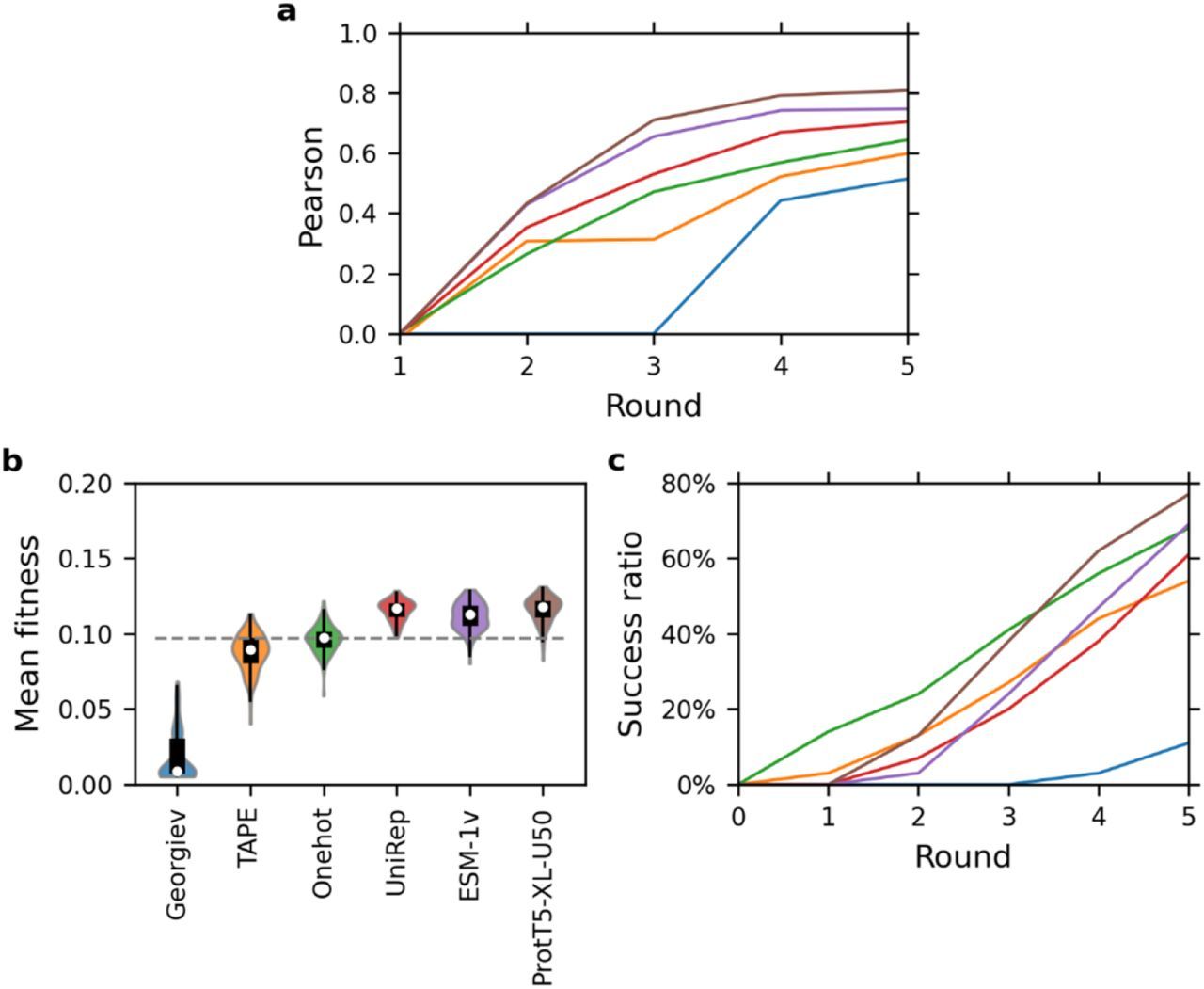 首先,a图展示了编码策略对代用模型质量的影响,以Pearson相关系数为评价标准。本文首先从GB1景观中抽取了384个样本,然后用剩余的数据建立了一个新的景观。在这个新的实验景观上进行了模拟,并在保留的测试集上评估了代用模型。本文发现,对于所有的编码策略来说,随着更多轮的迭代,模型的性能不断提高,这表明模型的改进是由与景观数据的相互作用造成的。另一方面,内容丰富的编码并不能保证有好的模型。与Onehot编码相比,使用UniRep、ESM-1v和ProtT5-XL-U50等学习型编码是可行的,而使用TAPE或Georgiev编码是不可行的。