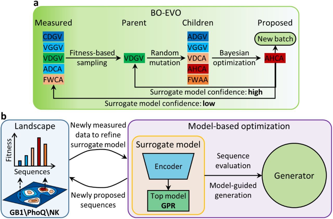 BO-EVO整合了具有互补优势的BO和进化算法,在评估整个蛋白质组合空间(20^N)时,BO的计算时间随着目标残基的数量(N)呈指数级增长。为了提高算法的可扩展性,BO-EVO将搜索限制在由父序列的随机突变(进化算法)产生的子空间。父序列或者通过基于适应度的抽样从测量的序列中抽出,或者根据代用模型的置信度设置为一个新提出的序列。另一方面,与贪婪的进化算法相比,BO允许加强探索。本文使用GPR(高斯过程回归)作为代用模型来量化不确定性。GPR是在由蛋白质序列表征法,如预训练模型ESM-1v编码的序列上训练的。为了确定实验中突变体序列的优先次序,本文利用UCB作为获取函数来平衡探索和利用。一旦达到每轮设定的预算(即24、96、384个序列),就会在实验中创建一个突变体批次并进行分析。由此产生的序列功能数据被用来完善代用模型,以指导进一步的下回合的蛋白工程。