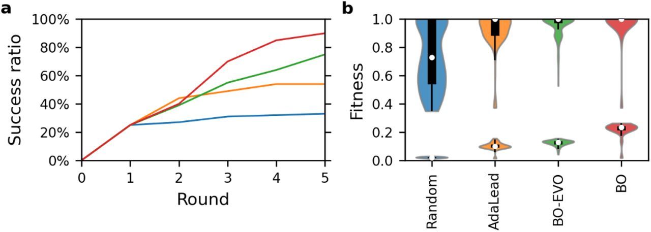 - 对比其他方法,BO-EVO不需要事先了解目标蛋白的结构或同源序列,也不需要通过进化算法限制序列设计来评估整个虚拟设计空间。