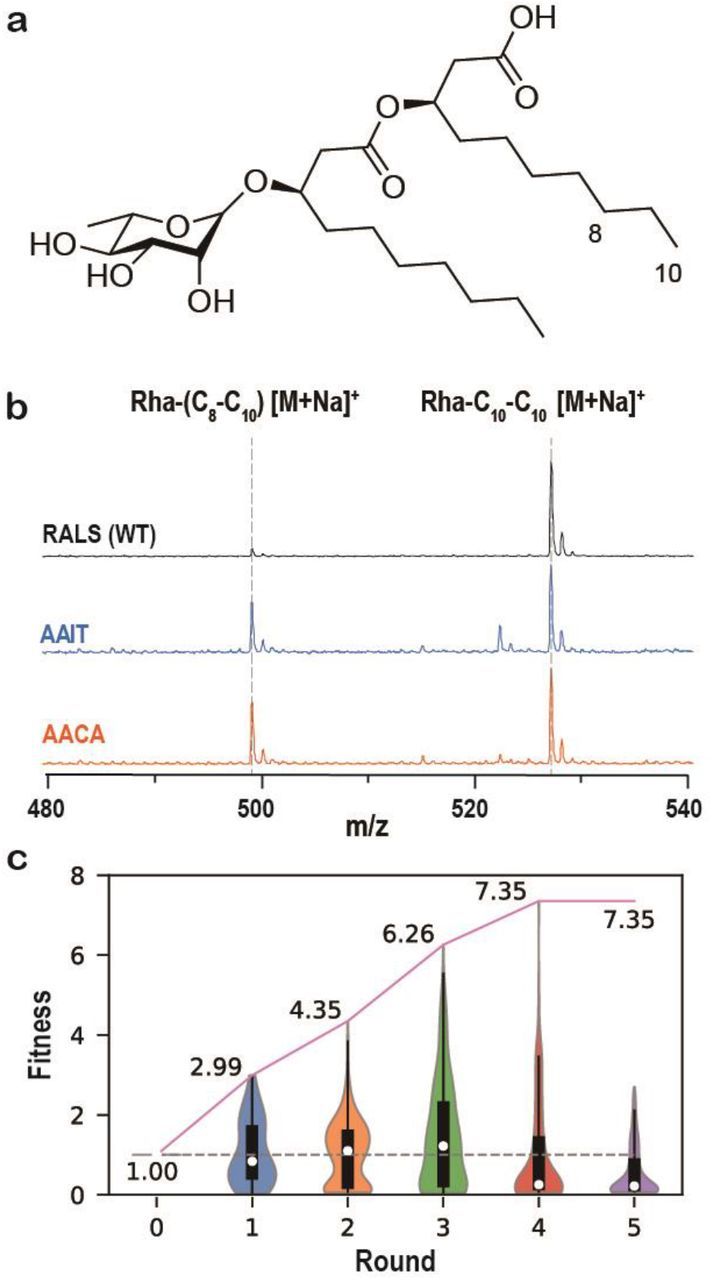 RhlA是一种关键的酶,负责合成鼠李糖脂(RLs)的脂质分子,这是一种重要的生物表面活性剂。RhlA的酶的特异性决定了脂质分子的化学结构(a图),这进一步影响了相应RL分子的生理化学和生物活性。然而,事实证明很难通过(半)理性设计或定向进化来改变RhlA的酶的特异性。为了将BO-EVO应用于RhlA工程,本文开发了一个机器人流程来建立和测试RhlA的4残基组合SSM库中16万个成员中的任何384个。为了测量酶的特异性,作者应用MALDI-ToF-MS来量化两个RL产品Rha-(C8-C10)和Rha-C10-C10(b图)。在微孔板培养中,携带WT型RhlA的大肠杆菌细胞产生Rha-C10-C10作为主要产物,故目标是将RhlA突变体的产物特异性转向较小的Rha-(C8-C10)。