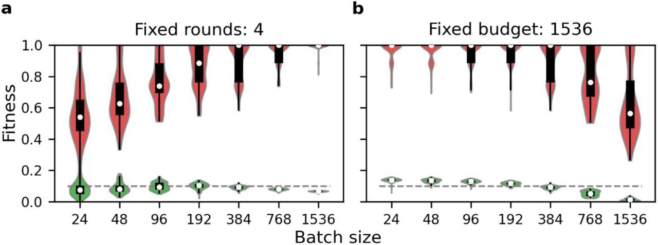 第一个实验(左图)将迭代数固定为4,这样蛋白质工程可以在一个月左右完成。作者观察到,最大适应度随着批次大小的增加而增加,当批次大小等于或大于384,或总样本预算等于或大于1,536时,可以持续达到全局最优。有趣的是,所有推出的变体的平均适应度先是增加,然后随着batch的增大而减少,这可能是由于序列空间中高适应度的变体数量有限(只有2.31%的变体表现出高于WT的适应度),以及BO-EVO在batch较大的情况下加强了对不适应度区域的探索。