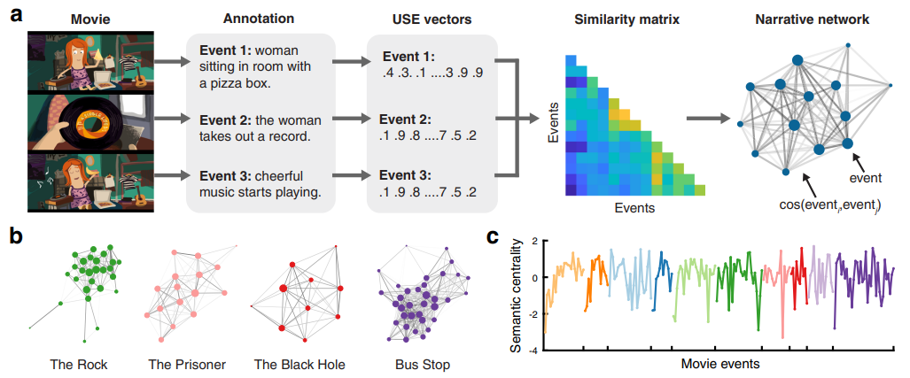 研究中,被试被播放多段卡通影片,每段影片描述的场景,经由谷歌的通用句子编码器被转换为一串类似词向量的表征。两个句子对应的向量距离越小,两个句子描述的场景越相似。之后根据语义相似性矩阵,以每一个影片为结构构建事件网络(图1a所示)。