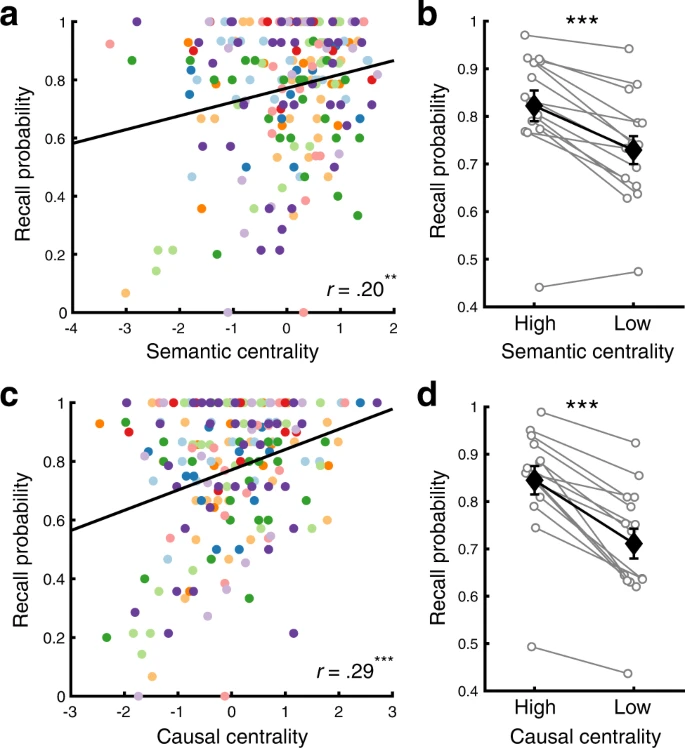 图2:(a,c)语义和因果网络中节点中心度和被回忆的概率的散点图;(b,d)将节点按照中心度分为高低两组,每名受试者回忆起对应事件的概率及人群均值