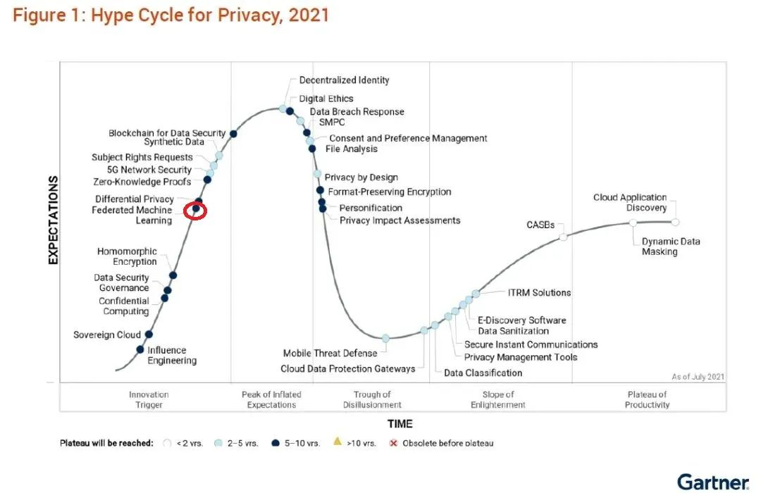 为了解释这个问题,他向大家展示了去年的 Gartner 技术成熟度曲线。这份曲线图显示,联邦学习当前正处于高速发展期,未来将成为一项非常重要的计算技术。这也是 Gartner 首次将联邦学习纳入技术成熟度曲线。