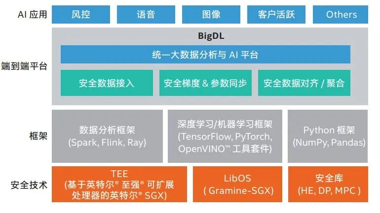 如图所示,基于英特尔® SGX 技术的 BigDL 提供了自下而上可信的安全技术、不同层面的软件框架以及用于连接大数据平台和联邦学习方法的端到端平台。