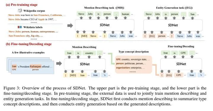 以上图中为例,给的少样本中Iran是GPE类别的实体,SDNet先用[MD]开头的模板生成了Iran是country的描述,将country加入到属于GPE这个新类别的概念描述集合中,在预测阶段用[EG]开头的模板输入GPE这个类别名、其包含的概念描述以及待识别的句子,生成属于GPE的实体词,完成实体识别。