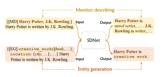 以下图为例,输入一个sentence(以[MD]作为起始符),SDNet将输出novel series这样的concept description。输入一个以[EG]作为起始符、实体类别名+相关的concept description以及待识别的sentence作为内容的文本,SDNet将输出Harry Potter is creative work.这样的回答。这两个过程分别对应Mention describing和Entity generation。