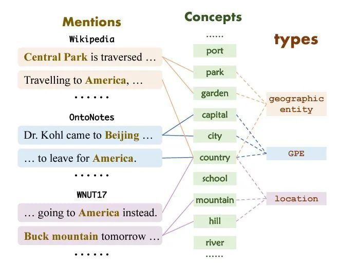 本文最重要的思想基于这样一个假设:不论是否是未知的实体类别,都可以用一个概念集中的若干概念来描述(all entity types can be described using the same set of concepts)。这样可以解决knowledge mismatch challenge,而且在给了几个少样本后,可以根据这几个少样本构建新实体类别到概念集的映射,这样可以直接用映射后的若干概念识别实体,进而解决limited information challenge。下图是实体类别到概念集的映射举例。