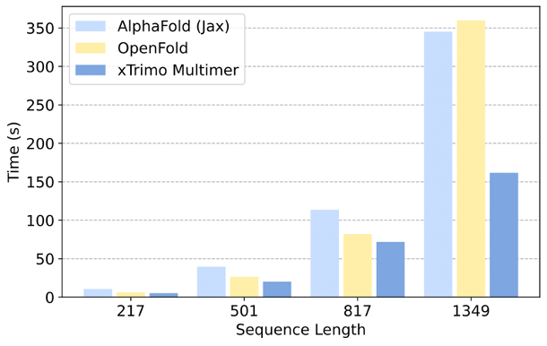 xTrimo Multimer可以支持长达4K的序列推理,此时OpenFold和AlphaFold 2受限于显存无法完成推理,而xTrimo Multimer可以在20分钟左右完成。