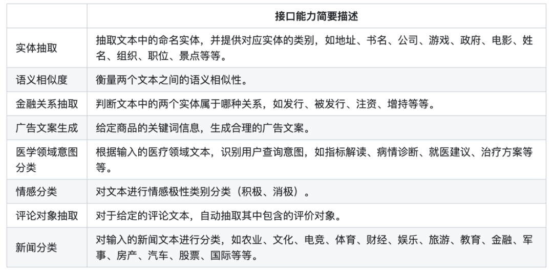 Mengzi Zero-Shot 项目提供的 SDK 目前已支持八项任务(涵盖了情感分类、新闻分类、文本相似度、实体抽取、金融实体关系抽取、评论对象抽取、广告文案生成、医疗领域意图识别等),具体信息详见 Github 项目文档。