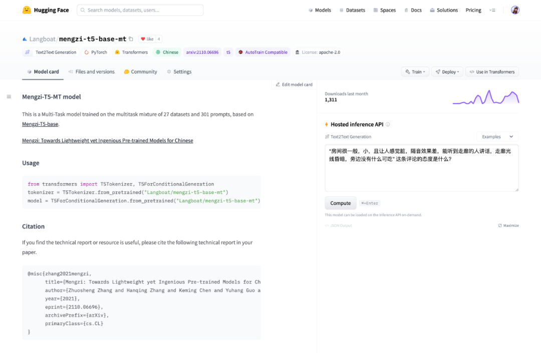孟子多任务模型已开源,大家可以在 Hugging Face Model Hub 下载 Mengzi-T5-base-MT 模型或在网页 API 直接试用模型: