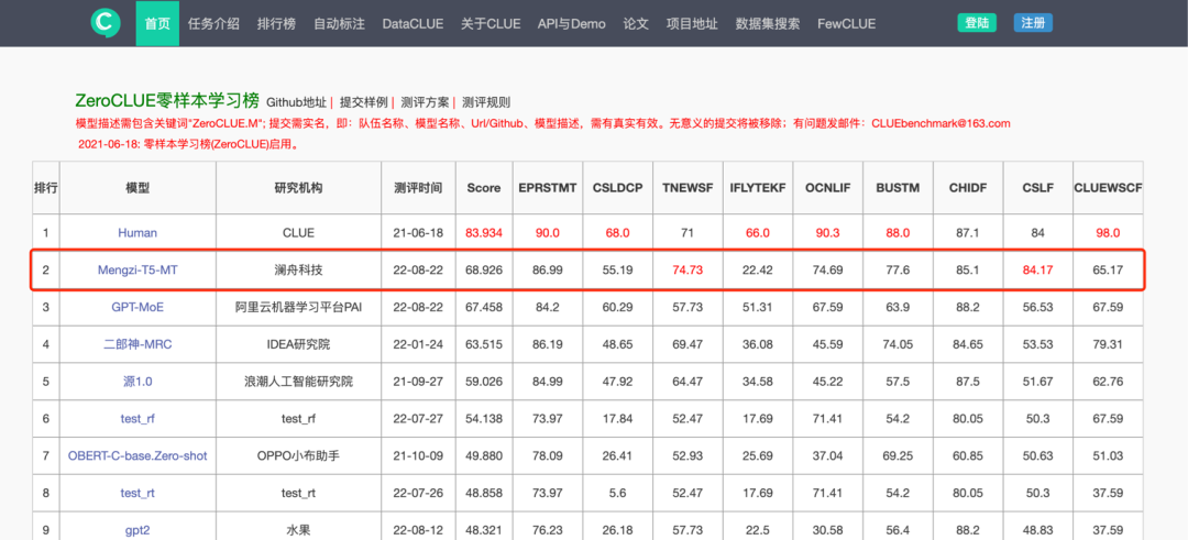 孟子多任务模型(Mengzi-T5-base-MT)在 2022 年 8 月 22 日提交至零样本学习 ZeroCLUE 和小样本学习权威榜单 FewCLUE 榜单,均排名第一。同时,孟子多任务模型在模型的规模上轻量化优势明显(参数量仅 0.22B)。下图展示了孟子多任务模型在零样本学习权威榜单 ZeroCLUE 上与其他模型的对比: