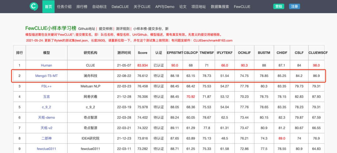 这与澜舟团队自创立以来一直倡导的“模型轻量化” 技术路线一脉相承——2021 年孟子轻量化预训练模型仅以十亿参数,战胜了众多百亿、千亿参数的大模型,登顶中文语言理解权威评测基准 CLUE 榜单,并在同年 10 月份开源了四个模型(Mengzi-BERT-base、Mengzi-BERT-base-fin、Mengzi-T5-base、Mengzi-Oscar-base)。