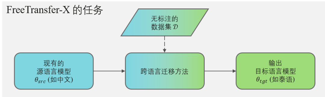 传统的多语言大模型落地基于“精调+模型压缩”,它通常依赖昂贵的标注数据。而【FreeTransfer-X】如图1所示,仅基于【现有的源语言模型】及【无标注数据】,输出【目标语言的模型】。同时我们为了快速适配源语言已有部署环境,要求目标语言模型与源语言模型架构保持完全一致。【FreeTransfer-X】能安全、高效地利用已有的NLP模型及无标注数据。