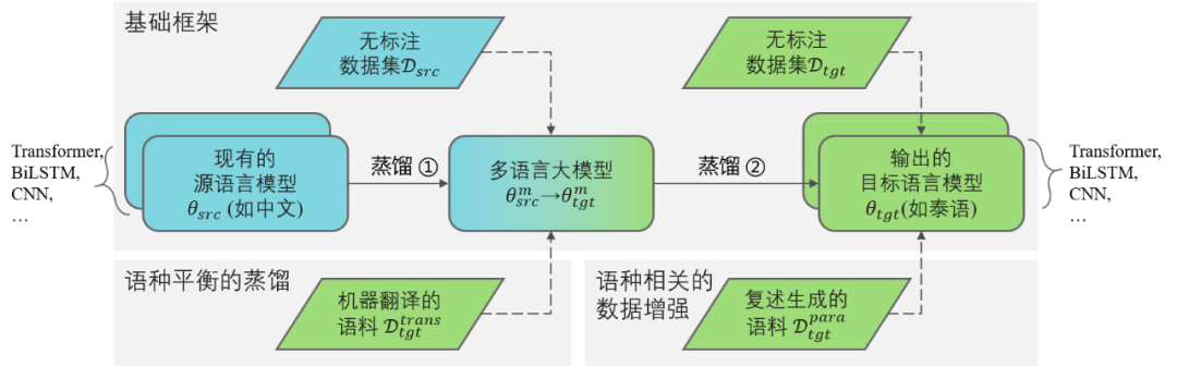 图2. 总体框架:基于多语言预训练模型、知识蒸馏和数据增强的【FreeTransfer-X】