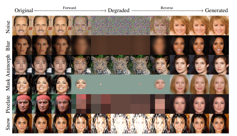 Cold Diffusion 继承了这两步工作流程,但又对之进行了升华式的修改。如下图所示,在图像退化再到逆转退化的过程中,Cold Diffusion 研究团队尝试了使用噪声、模糊、变形(Animorph)、遮罩(mask)、像素化(pixelate)、雪花等变换方式,且都得到了不错的效果。