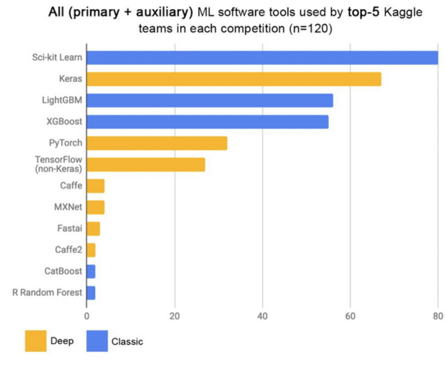 随着深度神经网络的不断发展,DNN在图像、文本和语音等类型的数据上都有了广泛的应用,然而对于同样非常常见的一种数据——表格数据,DNN却似乎并没有取得像它在其他领域那么大的成功。从Kaggle平台上对数据挖掘竞赛Top团队使用的工具统计上也能看出,XGBoost和LightGBM这类提升(Boosting)树模型依旧占据主要地位。