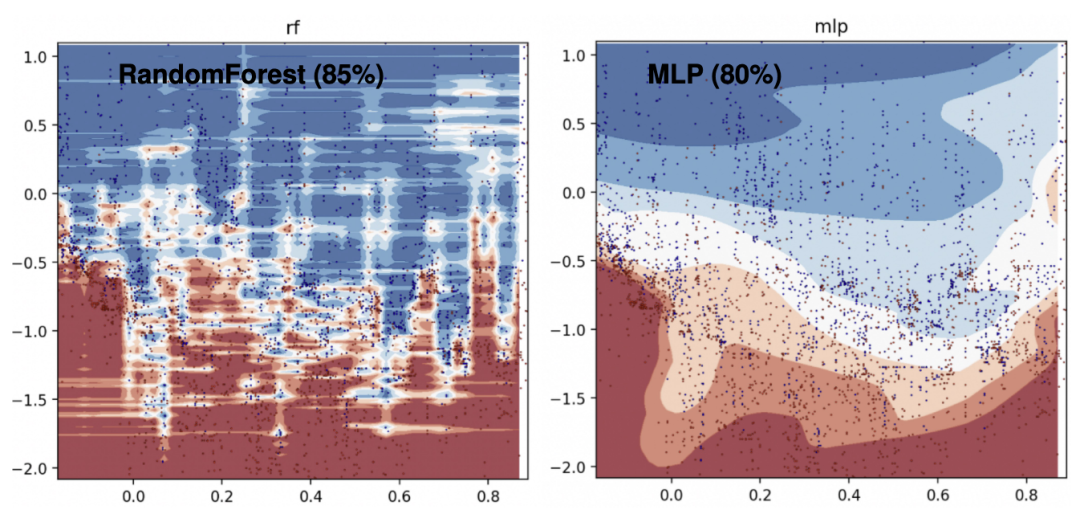 上图是电力数据集两个最重要特征的决策边界。在这一部分中,我们可以看到RandomForest能够学习MLP无法学习的x轴上的不规则模式(对应于日期特征)。