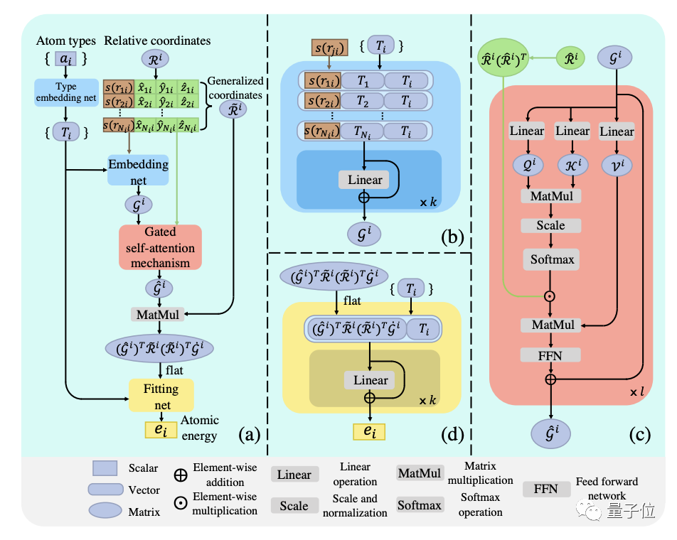 据介绍,该模型在原子局部环境矩阵上进行了类比多体(大量粒子构成的微观系统)相互作用的信息交互,并以正则化的相对坐标点乘作为角度信息,对获得注意力权重进行重新加权,以此来实现类似门控的机制。