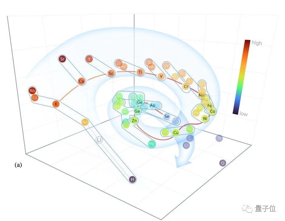 可以看到,所有元素都呈螺旋状分布,同周期元素沿着螺旋下降,同族元素则垂直螺旋方,恰好对应的是元素周期表的位置。