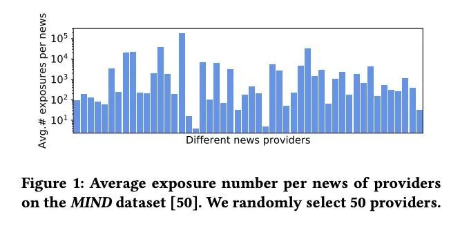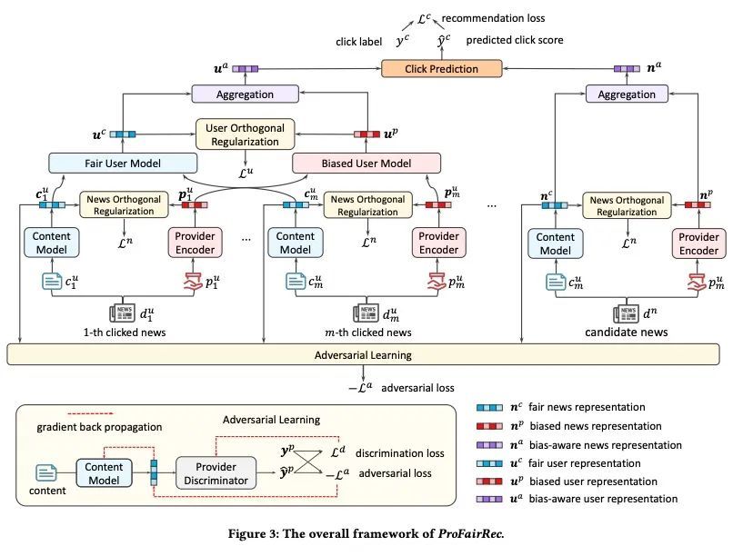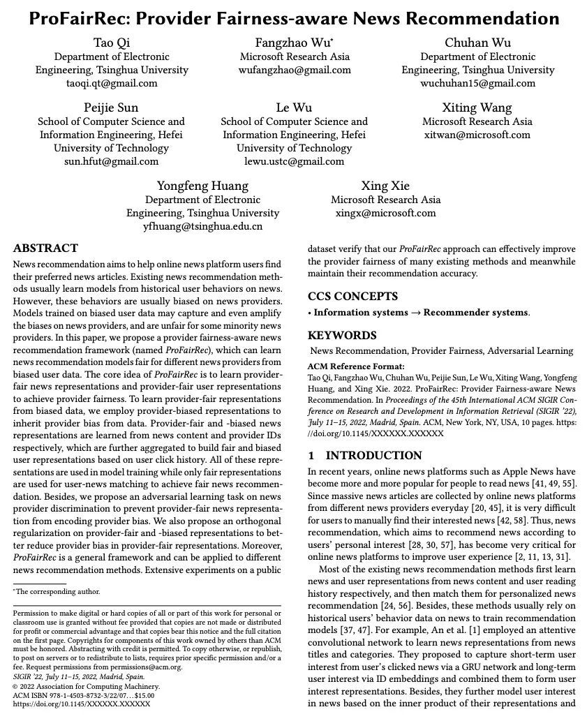ProFairRec: 提供者公平感知新闻推荐。新闻推荐的目的,是帮助在线新闻平台用户找到他们喜欢的新闻文章。现有的新闻推荐方法通常从用户的历史新闻行为中学习模型。然而,这些行为通常对新闻提供者有偏差。在有偏差的用户数据上训练出来的模型,可能会捕捉甚至放大对新闻提供者的偏差,对一些少数的新闻提供者是不公平的。本文提出一种提供者公平感知的新闻推荐框架ProFairRec,可以从有偏差的用户数据中学习对不同新闻提供者公平的新闻推荐模型。ProFairRec的核心思想是学习提供者公平的新闻表示和提供者公平的用户表示以实现提供者公平。为了从有偏差的数据中学习提供者公平的表示,本文采用有偏差的提供者表示来继承数据中的提供者偏差。提供者公平和有偏差的新闻表示分别从新闻内容和提供者ID中学习,这些表示被进一步汇总以建立基于用户点击历史的公平和有偏差的用户表示。所有这些表示都被用于模型训练,而只有公平表示被用于用户-新闻匹配,以实现公平的新闻推荐。此外,本文提出一种关于新闻提供者歧视的对抗学习任务,以防止提供者的公平新闻表示被编码为提供者的偏差。本文还提出了一种关于提供者-公平和有偏差的表示的正交正则化,以更好地减少提供者-公平表示中的提供者偏差。此外,ProFairRec是一个通用框架,可以应用于不同的新闻推荐方法。在一个公共数据集上进行的大量实验证明,所提出的ProFairRec方法可以有效地改善许多现有方法的提供者公平性,同时保持它们的推荐准确性。