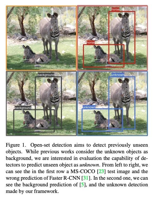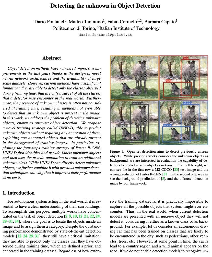 目标检测中的未知目标检测。由于新的神经网络结构设计和大规模数据集的可用性,目标检测方法在过去几年里有了令人印象深刻的改进。然而,目前的方法有一个显著的局限性:它们只能检测在训练期间观察到的类别,而这些类别只是检测器在现实世界中可能遇到的所有类别的一个子集。此外,在训练时往往不考虑未知类别的存在,导致方法甚至不能检测到图像中存在未知目标。本文解决了检测未知目标的问题,即所谓的开放集目标检测。本文提出一种新的训练策略UNKAD,能在不需要任何标注的情况下预测未知目标,利用已经存在于训练图像背景中的非标注目标。特别是,利用Faster R-CNN的四步训练策略,UNKAD首先识别和伪标记未知目标,然后用伪标记来训练一个额外的未知类别。虽然UNKAD可以直接检测未知目标,但进一步将其与之前的未知目标检测技术相结合,显示出它在不付出任何代价的情况下提高了它们的性能。
