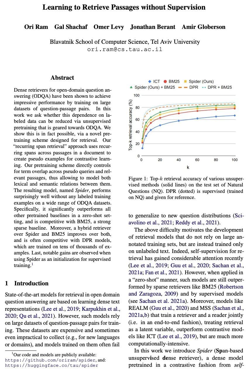 无监督段落检索学习。用于开放域问答(ODQA)的稠密检索器通过对问题-段落对的大型数据集进行训练,已被证明能取得令人印象深刻的性能。本文研究是否可通过针对ODQA的无监督预训练,来减少这种对标记数据的依赖。通过一个为检索设计的新的预训练方案,证明这实际上是可能的。所提出的"循环跨度检索"方法用文档中的重复跨度来创建对比学习的伪样本。所提出的预训练方案直接控制了伪查询和相关段落之间的术语重叠,因此可以对它们之间的词汇和语义关系进行建模。由此产生的模型即Spider,在广泛的ODQA数据集上,不需要任何标记的训练样本就能表现出令人惊讶的性能。具体来说,它在领样本设置中的表现明显优于所有其他预训练基线,并与BM25(一个强大的稀疏基线)相竞争。此外,在Spider和BM25上的混合检索器比两者都要好,并且通常与DPR模型竞争,后者是在数万个样本上训练的。最后,当使用Spider作为监督训练的初始化时,可以观察到明显的收益。